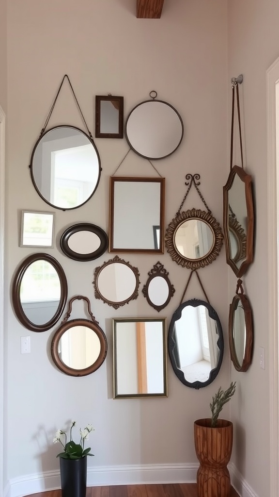 Making a pile of artful small mirrors can give the entrance of the home a great dynamic. It brings personality and charm, and enlarges and brightens the space. Create a playful but stylish statement by mixing shapes and sizes!